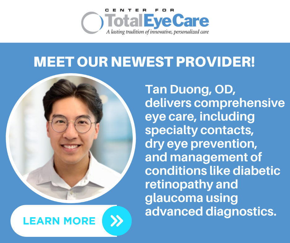 Dr. Tan Duong is an optometrist at Center for Total Eye Care who provides comprehensive eye care for patients, with special interests in fitting soft and specialty contact lenses, preventing dry eyes, managing ocular diseases such as diabetic retinopathy and glaucoma, and utilizing advanced diagnostic technologies including OCT, visual field testing, B-scan ultrasound, and corneal topography.